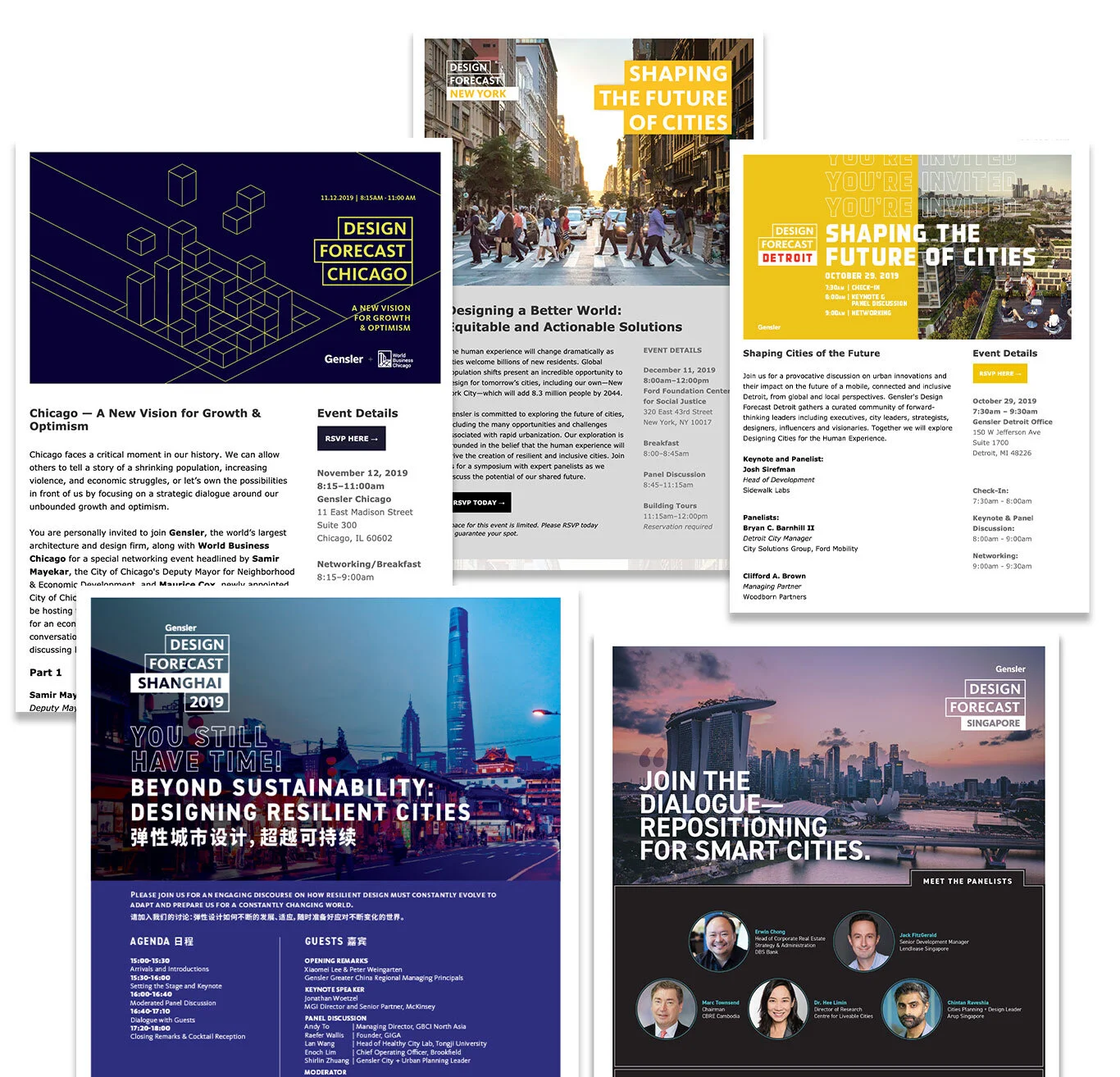 In addition to the main LIVE event, local offices across the firm hosted Design Forecast Local events to extend the conversation locally. Each offices expanded the brands upon the original branding.